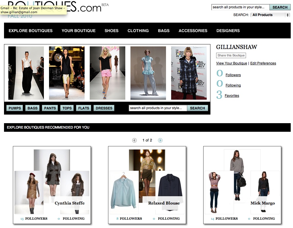 For those who are unsure about creating their own style, boutiques.com will throw out recommendations and match up outfits. It will also remember if you hate polka dots or balk at pleats and test you out with various images and outfits to get a measure of your taste.
